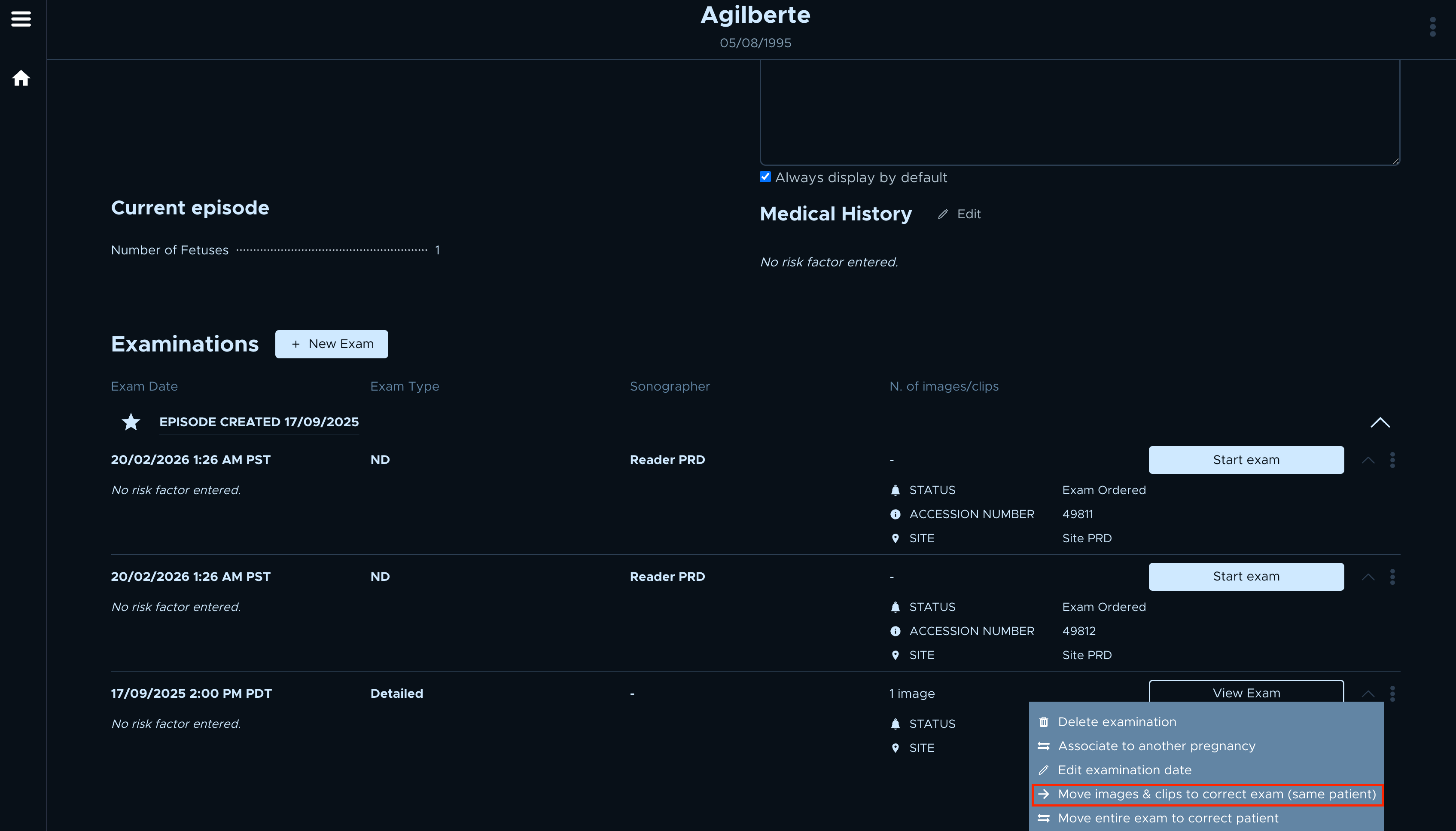 - Navigate to the patient record that currently has the exam