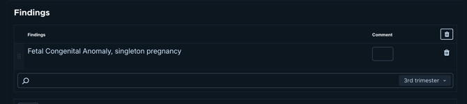 To find the code that reflects the reason for the visit start typing in the search bar. A list of ICD-10 codes will appear and you can select the right one. Sonio automatically filters ICD-10 codes based on the fetal trimester.